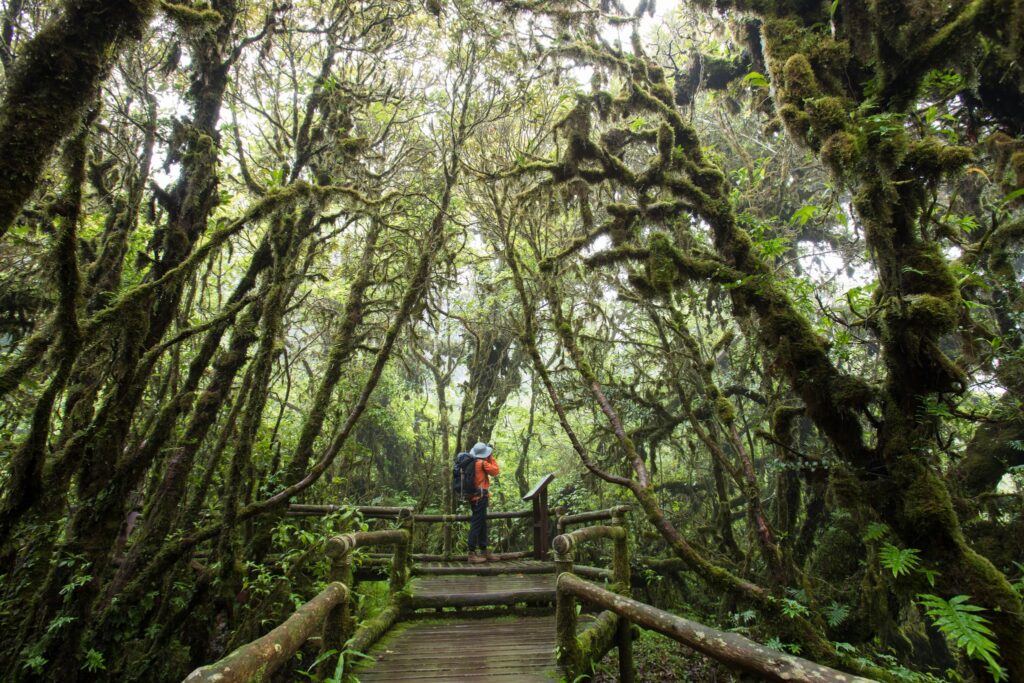 สาเหตุที่สภาพป่าบริเวณนี้ดูแปลกตา เพราะอยู่สูงจากระดับน้ำทะเลถึง 2,500 เมตร และด้วยสภาพอากาศหนาวเย็นชุ่มชื้นด้วยก้อนเมฆโฉบผ่านไปมาตลอดทั้งปี ทำให้ระบบนิเวศในบริเวณนี้มีความแตกต่างจากพื้นที่อื่นในประเทศไทย บางคนอาจเห็นเป็นต้นไม้ใส่เสื้อสีเขียว บางคนเห็นเป็นป่าดึกดำบรรพ์ที่เคยมีไดโนเสาร์เดินไปมา บ้างก็ว่าเหมือนป่าที่อยู่ใต้ทะเลแล้วผุดขึ้นมาตอนน้ำลด ตามแต่จินตนาการพาไป ใครเห็นมาแล้วเป็นแบบไหน เชิญเล่าให้ฟังได้.